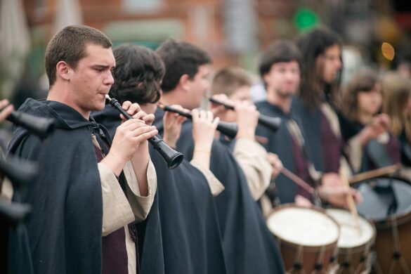 塔を披露する際の音楽も重要な役割を果たしています。グラリャ(Gralla)と呼ばれる笛と太鼓はカステイを組む際の「道標」的な存在。音楽なしにはカステリェルスは始まりも終わりもないのです。小さな子どもが2層目、3層目とよじ登り、最後に頂上で手をあげて塔の最上部が完成した際の音も決まっています。人間の塔をひとつふたつ見てみると、音楽のタイミングがいかに重要で音楽隊までも手に汗握りながら、音で応援しているのがわかります。