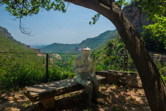 教会を出たところの敷地内の小さな広場では、カタルーニャを代表する作家ジョセップ・プラの銅像が一休み。カタルーニャ語で土地の魅力を小説やエッセイの形で語った彼の作品にも、この場所が少なからずのインスピレーションを与えたのだとか。